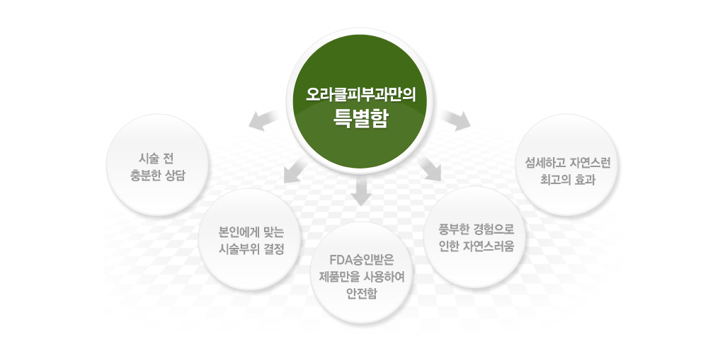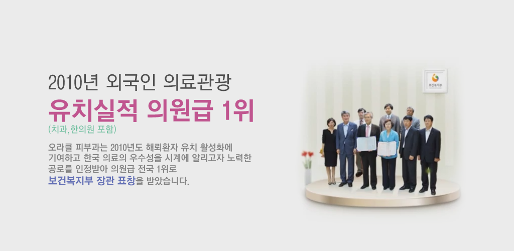 2004년도 대전에서 최초 개원한 오라클 클리닉은 체계화된 의료 시스템을 기반으로 하여 현재 국내 최대의 네트워크 병원으로 성장하였습니다. 고객만족을 최우선으로 생각하는 오라클 클리닉은 높은 의료수준뿐만 아니라 지속적은 소통과 세심한 배려로써 고객만족을 실현하고 있으며, 각종 대외 수상실적을 통해 이미 높은 고객 만족도를 입증하고 있습니다. “진료의 표준화와 체계화로 국제적 경쟁력이 있는 병원”을 목표로 2015년 현재 국내 피부과 1천여개 중 1위, 성형외과 1천여개 중 10위권이며, 국내 최고의 의료진 (피부과 전문의 80명, 성형외과 전문의 7명, 치과 전문의 6명) 과 전체 STAFF 약 500명이 근무하고 있습니다. 글로벌 의료시장을 선도하는 종합 헬스 케어 그룹을 목표로 국내 뿐 아니라 중국 20여개지점, 대만, 베트남, 필리핀, 인도네시아 등 세계 각지로 뻗어가고 있으며, 현재 중국 내 한국 피부/성형외과 프랜차이즈 지점 수 1위입니다.